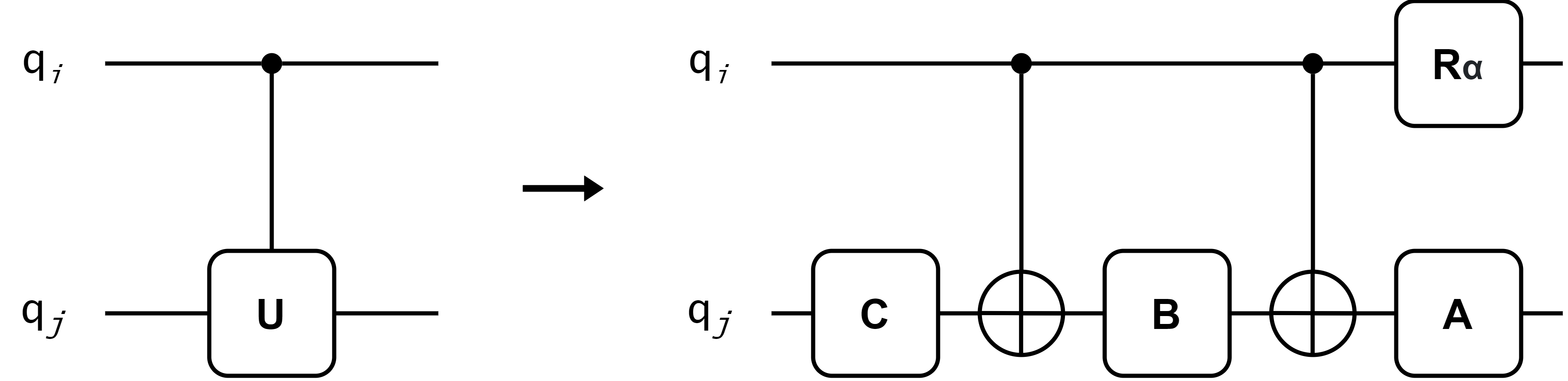 where \(\alpha\) denotes a global phase factor, and the single-qubit unitaries \(A\), \(B\), and \(C\), are chosen such that \(A \cdot B \cdot C = I\). In terms of the latter, the decomposition looks as illustrated below: